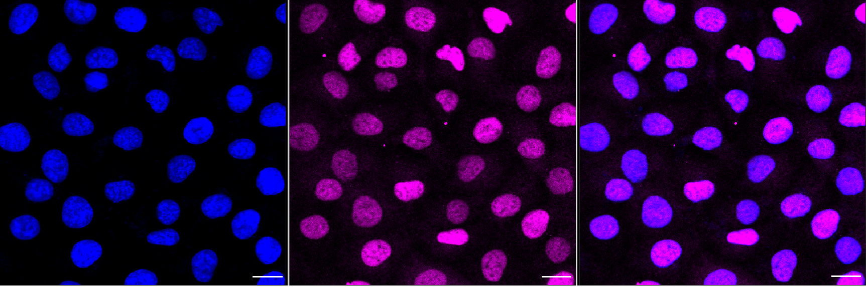• Immunocytochemical staining of HT-1080 cells with SOX9 antibody. Nuclei were stained blue with DAPI; SRY-Box Transcription Factor 9 was stained magenta with Alexa Fluor? 647. Images were taken using Leica stellaris 5. Protein abundance based on laser Intensity and smart gain: Medium. Scale bar, 20 μm.