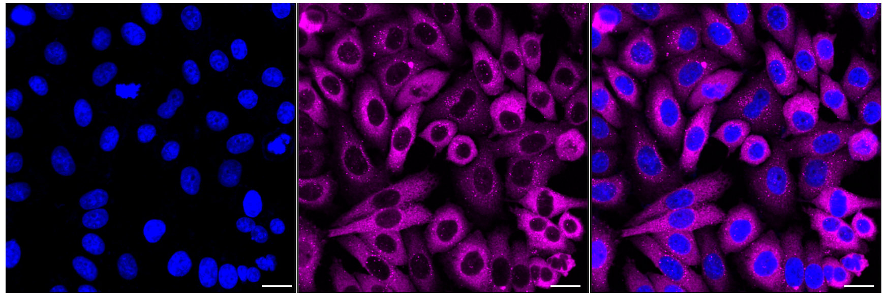 Immunocytochemical staining of HepG2 cells with p62/SQSTM1 antibody. Nuclei were stained blue with DAPI; p62/SQSTM1 was stained magenta with Alexa Fluor? 647. Images were taken using Leica stellaris 5. Protein abundance based on laser Intensity and smart gain: High. Scale bar: 20 μm.