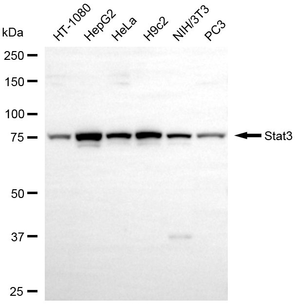 Western blotting analysis using stat3 antibody. Total cell lysates (30 μg) from various cell lines were loaded and separated by SDS-PAGE. The blot was incubated with stat3 antibody and HRP-conjugated goat anti-rabbit secondary antibody respectively.
