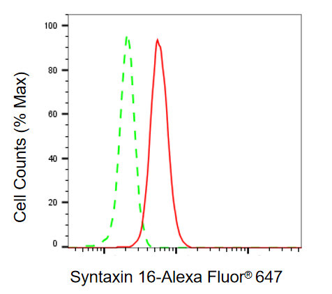 Flow cytometric analysis of syntaxin 16 expression in HepG2 cells using syntaxin 16 antibody. Green, isotype control; red, syntaxin 16.