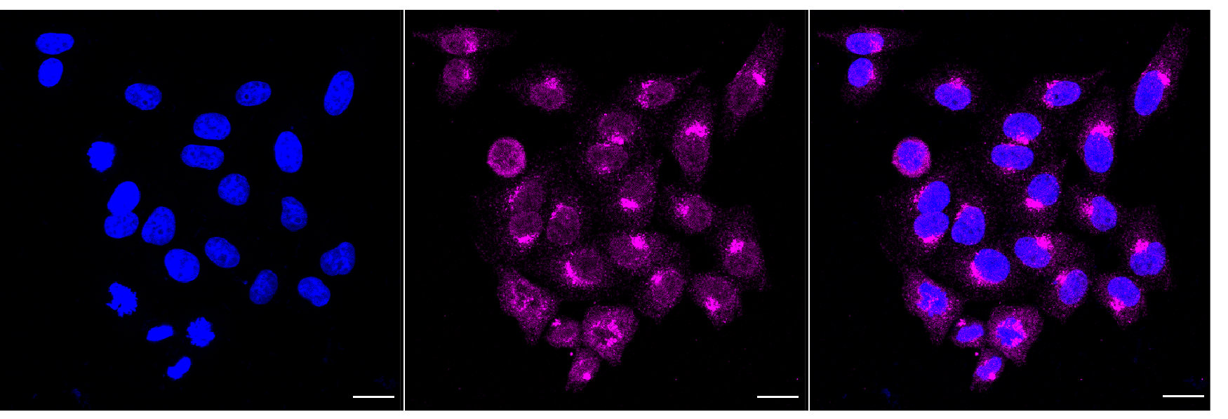 Immunocytochemical staining of HepG2 cells with syntaxin 16 antibody. Nuclei were stained blue with DAPI; Syntaxin 16 was stained magenta with Alexa Fluor? 647. Images were taken using Leica stellaris 5. Protein abundance based on laser Intensity and smart gain: Medium. Scale bar, 20 μm.
