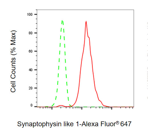 • Flow cytometric analysis of Synaptophysin like 1 expression in HeLa cells using Synaptophysin like 1 antibody. Green, isotype control; red, Synaptophysin like 1.