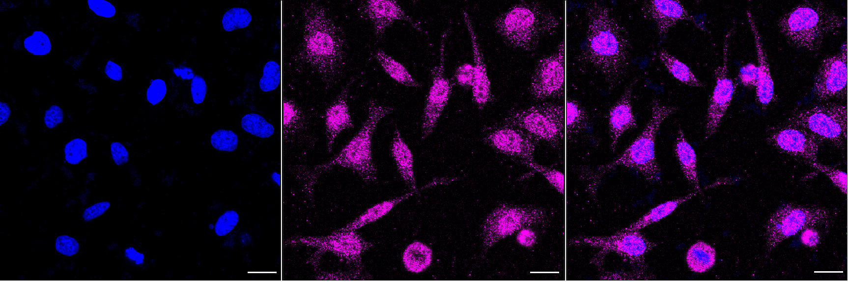 • Immunocytochemical staining of HeLa cells with Synaptophysin like 1 antibody. Nuclei were stained blue with DAPI;Synaptophysin like 1 was stained magenta with Alexa Fluor? 647. Images were taken using Leica stellaris 5. Protein abundance based on laser Intensity and smart gain: Medium. Scale bar, 20 μm.