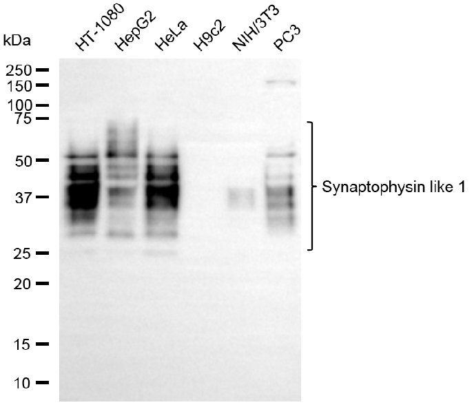 • Western blotting analysis using synaptophysin like 1 antibody. Total cell lysates (30 μg) from various cell lines were loaded and separated by SDS-PAGE. The blot was incubated with synaptophysin like 1 antibody and HRP-conjugated goat anti-rabbit secondary antibody respectively.
