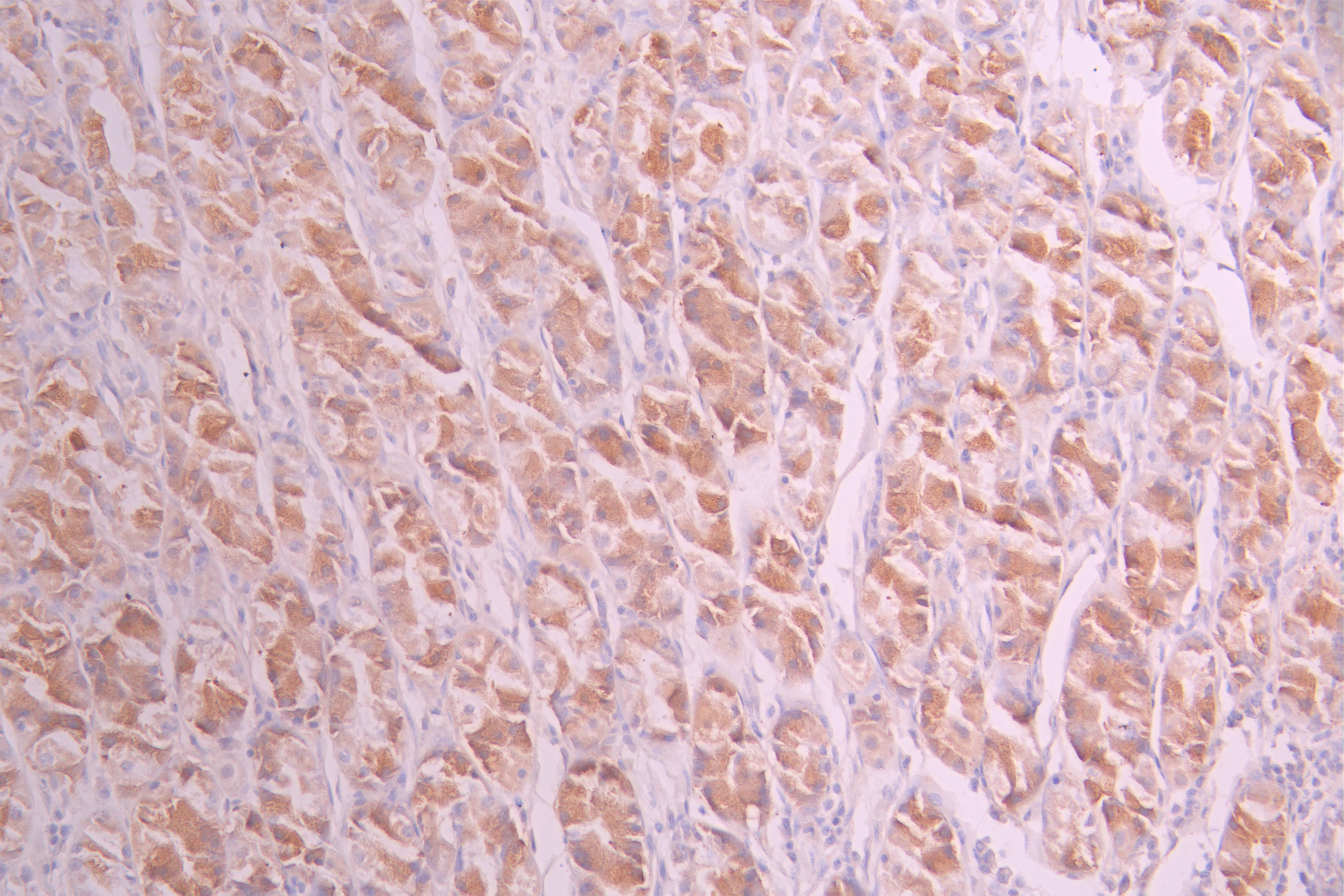 IHC image of CSB-RA243394A0HU diluted at 1:100 and staining in paraffin-embedded human stomach tissue performed on a Leica BondTM system. After dewaxing and hydration, antigen retrieval was mediated by high pressure in a citrate buffer (pH 6.0). Section was blocked with 10% normal goat serum 30min at RT. Then primary antibody (1% BSA) was incubated at 4°C overnight. The primary is detected by a Goat anti-rabbit polymer IgG labeled by HRP and visualized using 0.05% DAB.