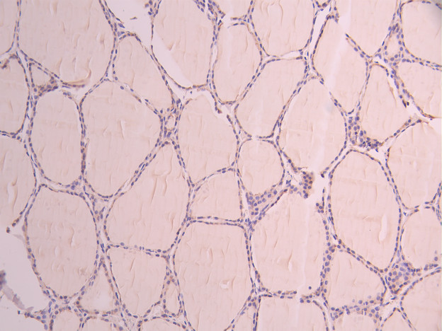 IHC image of CSB-RA153253A0HU diluted at 1:100 and staining in paraffin-embedded human thyroid tissue performed on a Leica BondTM system. After dewaxing and hydration, antigen retrieval was mediated by high pressure in a citrate buffer (pH 6.0). Section was blocked with 10% normal goat serum 30min at RT. Then primary antibody (1% BSA) was incubated at 4°C overnight. The primary is detected by a Goat anti-rabbit polymer IgG labeled by HRP and visualized using 0.05% DAB.