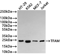 Positive WB detected in: HT-29 whole cell lysate(30μg), K562 whole cell lysate(30μg), MCF-7 whole cell lysate(30μg), Jurkat whole cell lysate(30μg)