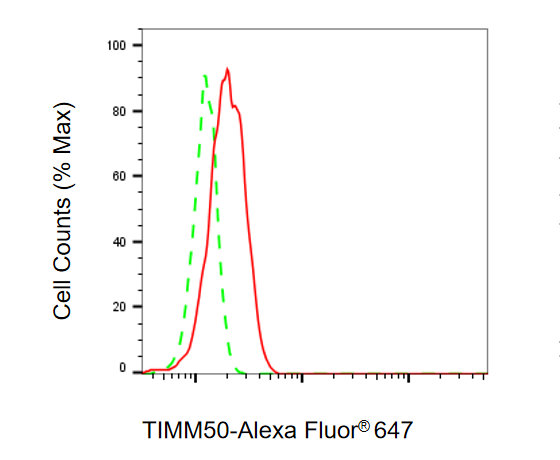 • Flow cytometric analysis of TIMM50 expression in HepG2 cells using TIMM50 antibody. Green, isotype control; red, TIMM50.
