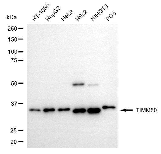 • Western blotting analysis using TIMM50 antibody. Total cell lysates (30 μg) from various cell lines were loaded and separated by SDS-PAGE. The blot was incubated with TIMM50 antibody and HRP-conjugated goat anti-rabbit secondary antibody respectively.
