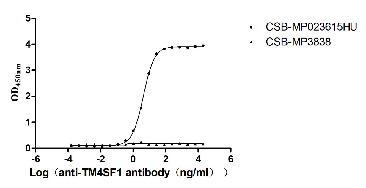 Activity: Measured by its binding ability in a functional ELISA. Immobilized Human TM4SF1(CSB-MP023615HU) at 5 μg/mL can bind Anti-TM4SF1 recombinant antibody. the EC50 is 4.079-4.472 ng/mL.