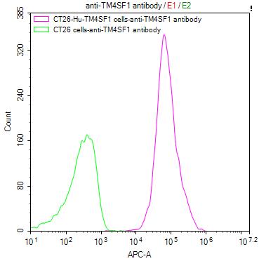 Untransfected CT26 cells (green line) and transfected Human TM4SF1*106cells), washed and then followed by APC-conjugated anti-Human IgG Fc antibody and analyzed with flow cytometry.
