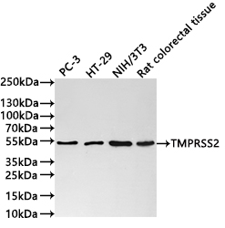 Positive WB detected in: PC-3 whole cell lysate(30μg), HT-29 whole cell lysate(30μg), NIH/3T3 whole cell lysate(30μg), Rat colorectal tissue lysate(30μg)
