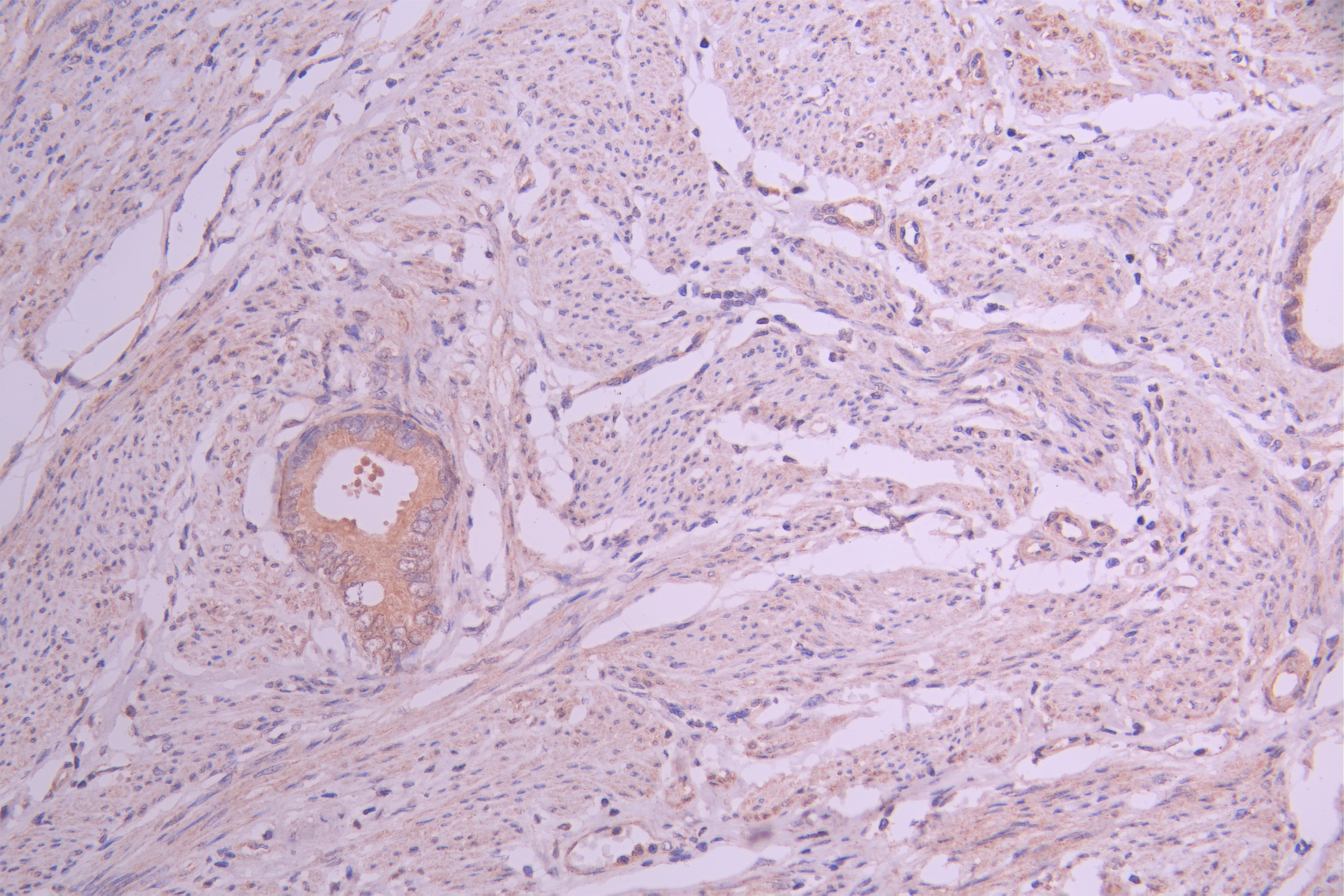 IHC image of CSB-RA023954MA1HU diluted at 1:50 and staining in paraffin-embedded human cervical cancer performed on a Leica BondTM system. After dewaxing and hydration, antigen retrieval was mediated by high pressure in a citrate buffer (pH 6.0). Section was blocked with 10% normal goat serum 30min at RT. Then primary antibody (1% BSA) was incubated at 4°C overnight. The primary is detected by a Anti-Human lgG, Fcy Fragment Specific labeled by HRP and visualized using 0.05% DAB.