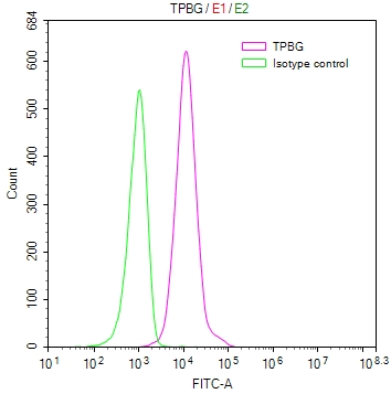 Overlay Peak curve showing MCF7 cells stained with CSB-RA024093MA2HU (red line) at 1:100. Then 10% normal goat serum to block non-specific protein-protein interactions followed by the antibody (1ug/1*106cells) for 45min at 4℃. The secondary antibody used was FITC-conjugated Goat Anti-human IgG(H+L) at 1:200 dilution for 35min at 4℃.Control antibody (green line) was human IgG (1ug/1*106cells) used under the same conditions. Acquisition of >10,000 events was performed.