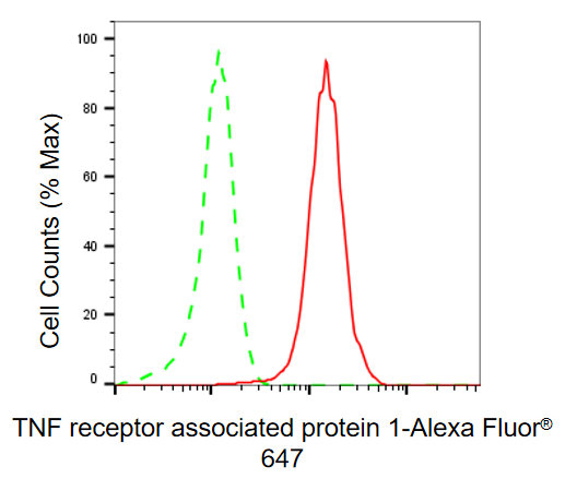 Flow cytometric analysis of TNF receptor associated protein 1 expression in HepG2 cells using TNF receptor associated protein 1 antibody. Green, isotype control; red, TNF receptor associated protein 1.