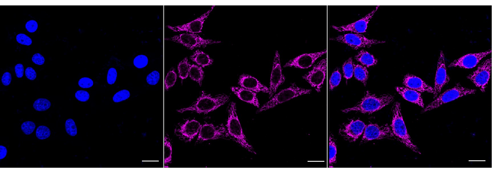 Immunocytochemical staining of HepG2 cells with TNF receptor associated protein 1 antibody. Nuclei were stained blue with DAPI; TNF receptor associated protein 1 was stained magenta with Alexa Fluor? 647. Images were taken using Leica stellaris 5. Protein abundance based on laser Intensity and smart gain: High. Scale bar, 20 μm.