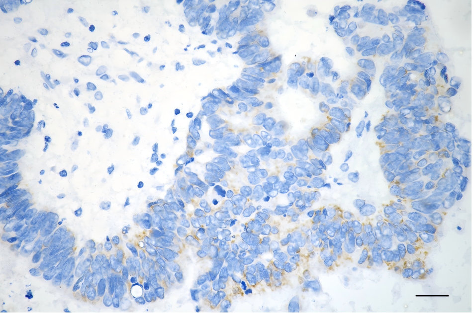Immunohistochemistry was performed on paraffin-embedded human sigmoid colon carcinoma using TNF receptor associated protein 1 antibody. Antigen retrieval was done in sodium citrate buffer (pH 6.0). DAB was used for detection, with hematoxylin counterstaining. Images were acquired using a Nikon Ci-L Plus microscope (40× objective). Scale bar: 25 μm.