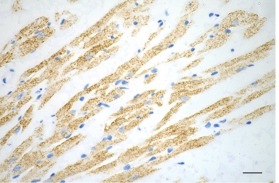 Immunohistochemistry was performed on paraffin-embedded mouse heart using TNF receptor associated protein 1 antibody. Antigen retrieval was done in sodium citrate buffer (pH 6.0). DAB was used for detection, with hematoxylin counterstaining. Images were acquired using a Nikon Ci-L Plus microscope (40× objective). Scale bar: 25 μm.