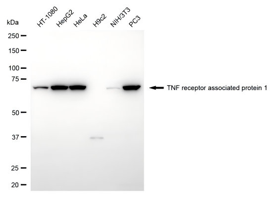Western blotting analysis using TNF receptor associated protein 1 antibody. Total cell lysates (30 μg) from various cell lines were loaded and separated by SDS-PAGE. The blot was incubated with TNF receptor associated protein 1 antibody and HRP-conjugated goat anti-rabbit secondary antibody respectively.
