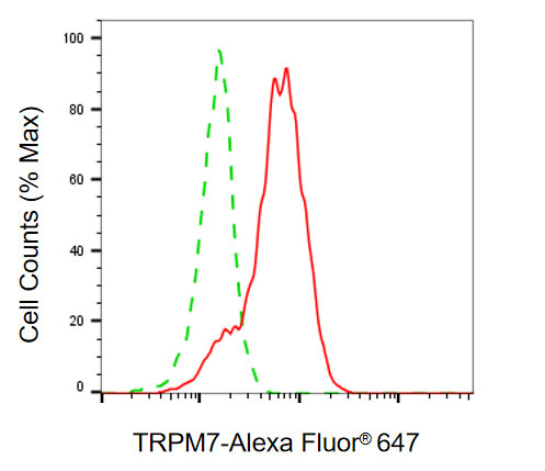 Flow cytometric analysis of TRPM7 expression in HepG2 cells using TRPM7 antibody. Green, isotype control; red, TRPM7.