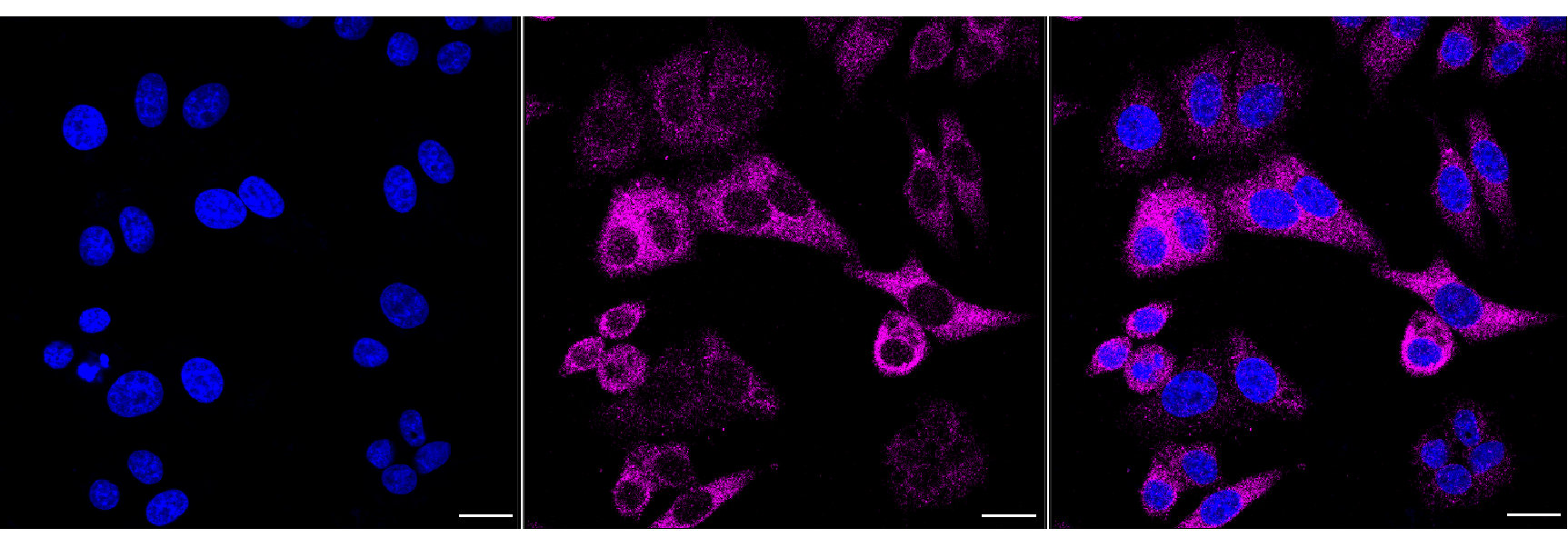 Immunocytochemical staining of HepG2 cells with TRPM7 antibody. Nuclei were stained blue with DAPI;TRPM7 was stained magenta with Alexa Fluor? 647. Images were taken using Leica stellaris 5. Protein abundance based on laser Intensity and smart gain: Medium. Scale bar, 20 μm.