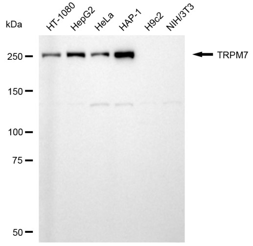 Western blotting analysis using TRPM7 antibody. Total cell lysates (30 μg) from various cell lines were loaded and separated by SDS-PAGE. The blot was incubated with TRPM7 antibody and HRP-conjugated goat anti-rabbit secondary antibody respectively.
