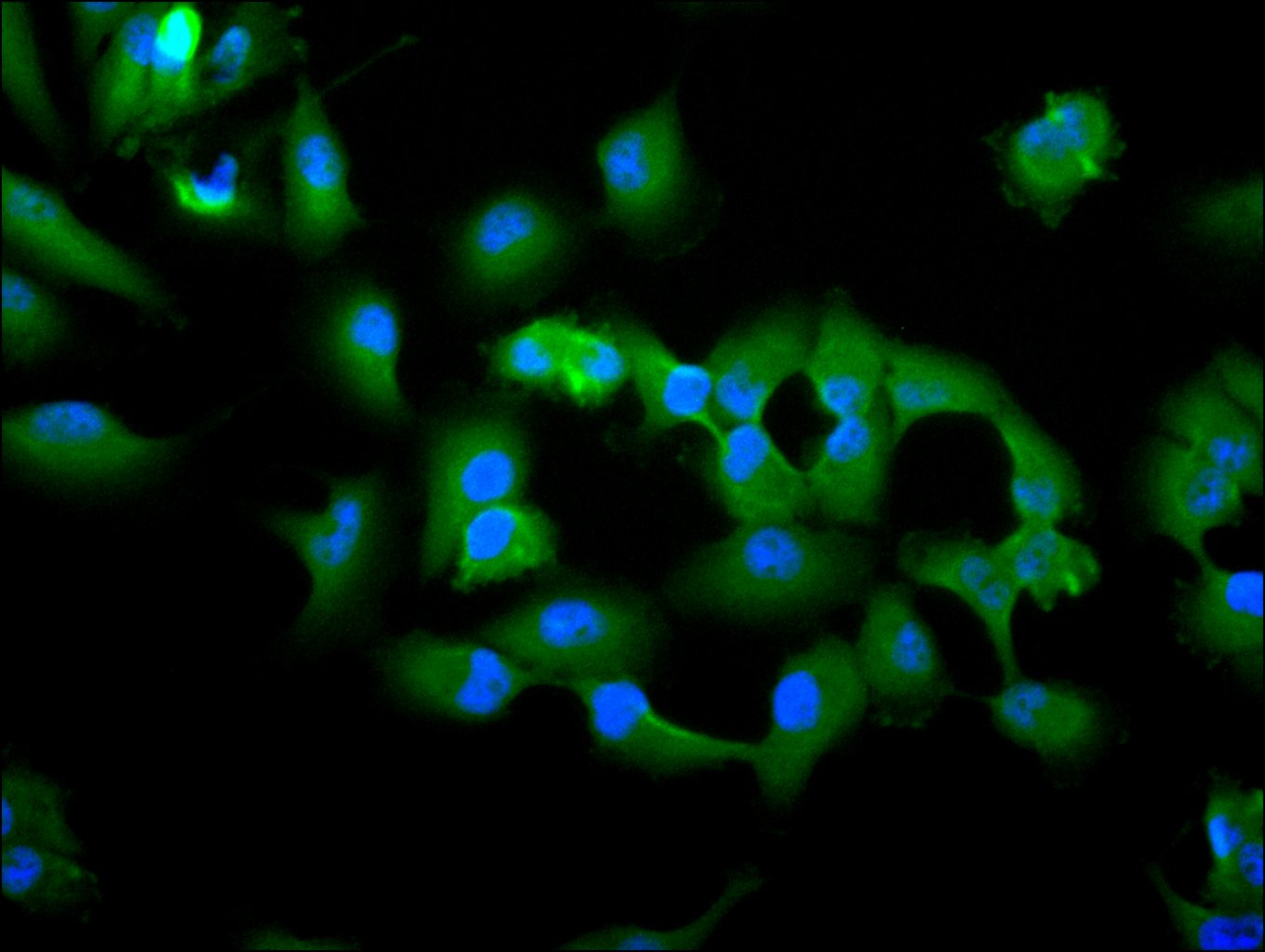 Immunofluorescence staining of U251 cell with CSB-RA860355MA1HU at 1:30 counter-stained with DAPI. The cells were fixed in 4% formaldehyde, permeabilized using 0.2% Triton X-100 and blocked in 10% normal Goat Serum. The cells were then incubated with the antibody overnight at 4°C. The secondary antibody was Alexa Fluor 488-congugated AffiniPure Goat Anti-Human IgG(H+L).