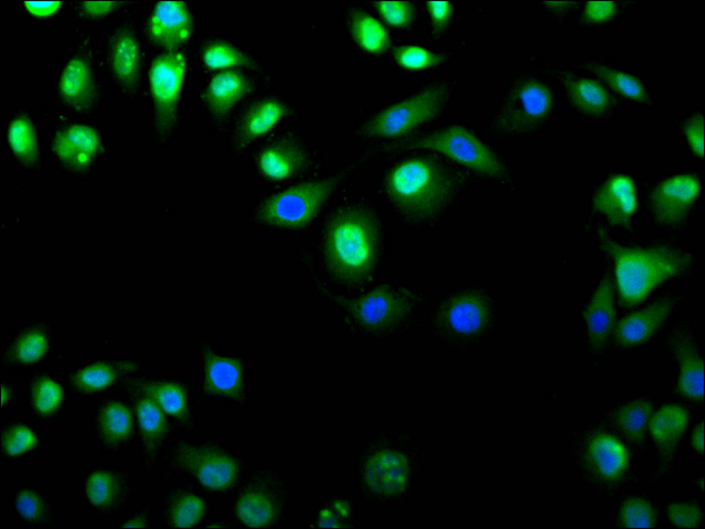 Immunofluorescence staining of Hela cell with CSB-RA768658A0HU at 1:50, counter-stained with DAPI. The cells were fixed in 4% formaldehyde, permeabilized using 0.2% Triton X-100 and blocked in 10% normal Goat Serum. The cells were then incubated with the antibody overnight at 4°C. The secondary antibody was Alexa Fluor 488-congugated AffiniPure Goat Anti-Rabbit IgG(H+L).