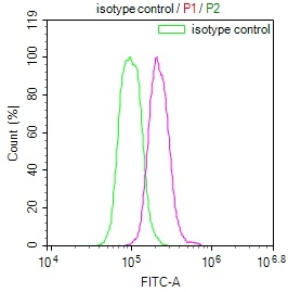 • Overlay Peak curve showing Hela cells stained with CSB-RA784212A0HU (red line) at 1:100. The cells were fixed in 4% formaldehyde and permeated by 0.2% TritonX-100. Then 10% normal goat serum to block non-specific protein-protein interactions followed by the antibody (1ug/1*106cells) for 45min at 4℃. The secondary antibody used was FITC-conjugated Goat Anti-rabbit IgG(H+L) at 1:200 dilution for 35min at 4℃.Control antibody (green line) was rabbit IgG (1ug/1*106cells) used under the same conditions. Acquisition of >10,000 events was performed.