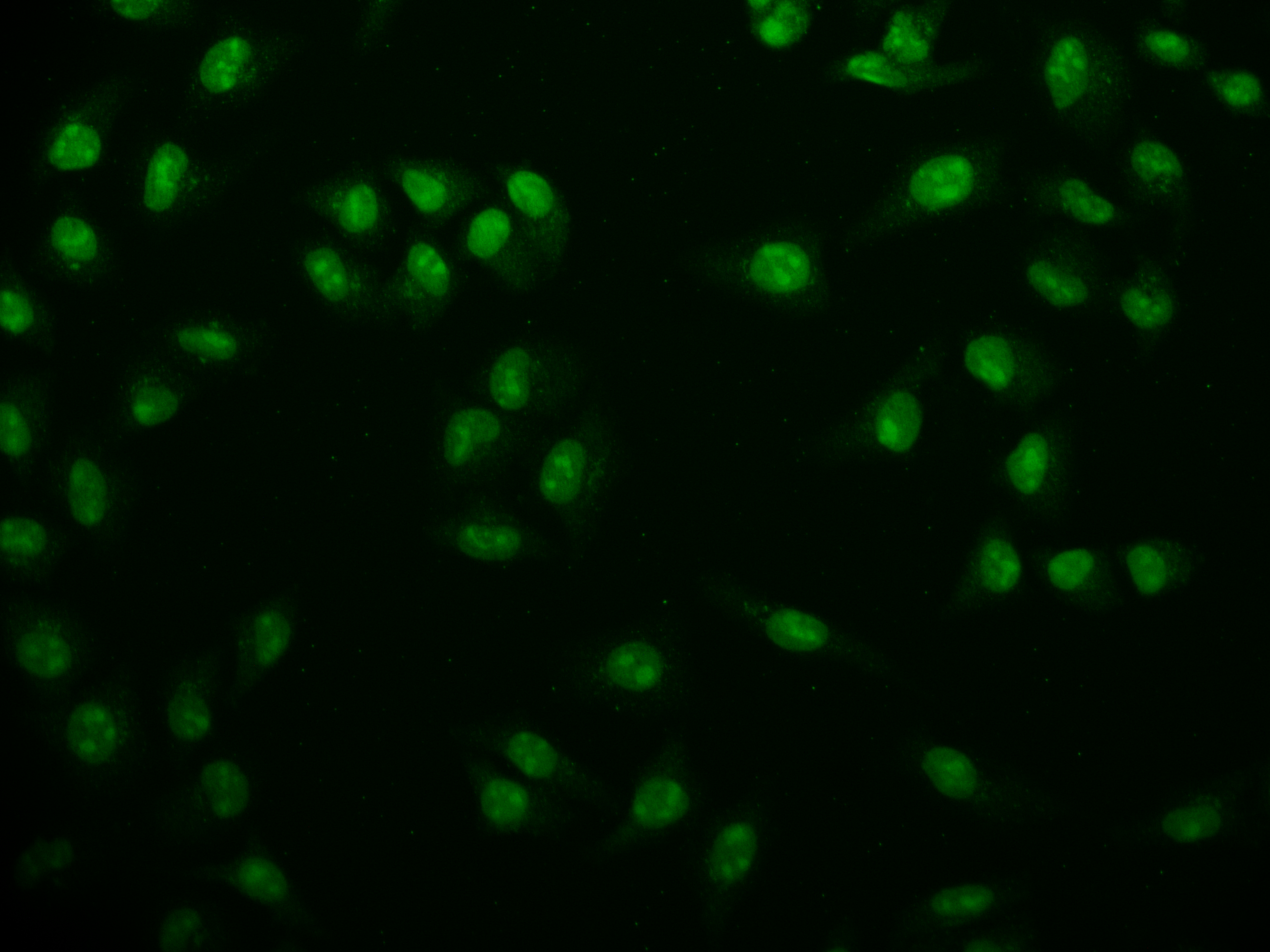 • Immunofluorescence staining of Hela cell with CSB-RA784212A0HU at 1:50, counter-stained with DAPI. The cells were fixed in 4% formaldehyde and blocked in 10% normal Goat Serum. The cells were then incubated with the antibody overnight at 4°C. The secondary antibody was Alexa Fluor 507-congugated AffiniPure Goat Anti-Rabbit IgG(H+L).