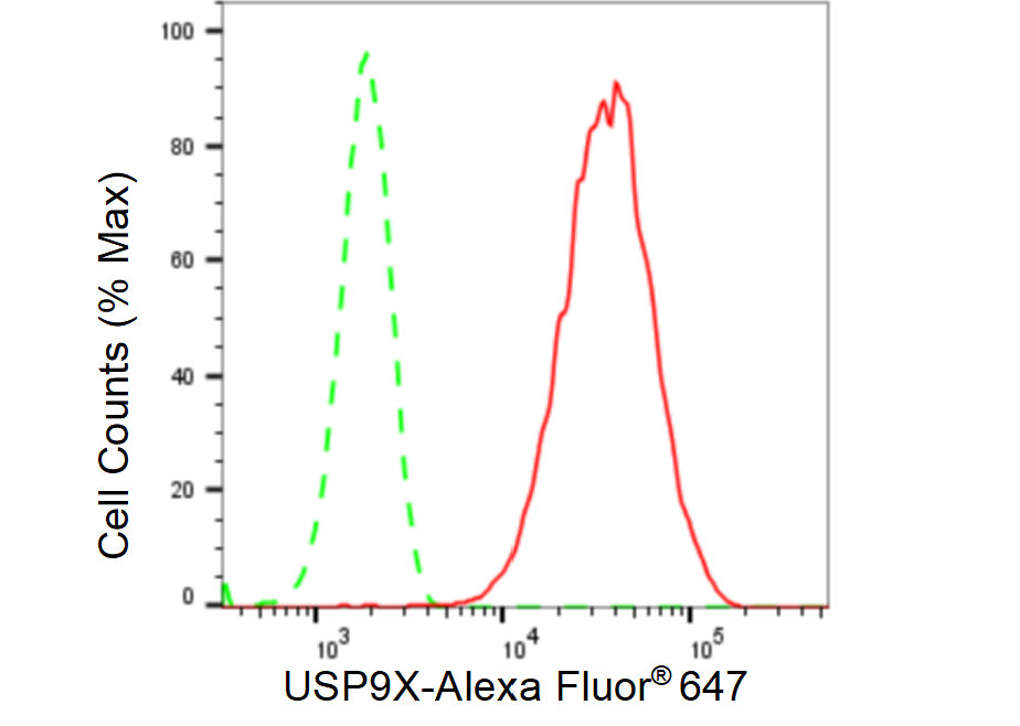Flow cytometric analysis of USP9X expression in HepG2 cells using USP9X antibody. Green, isotype control; red, USP9X.