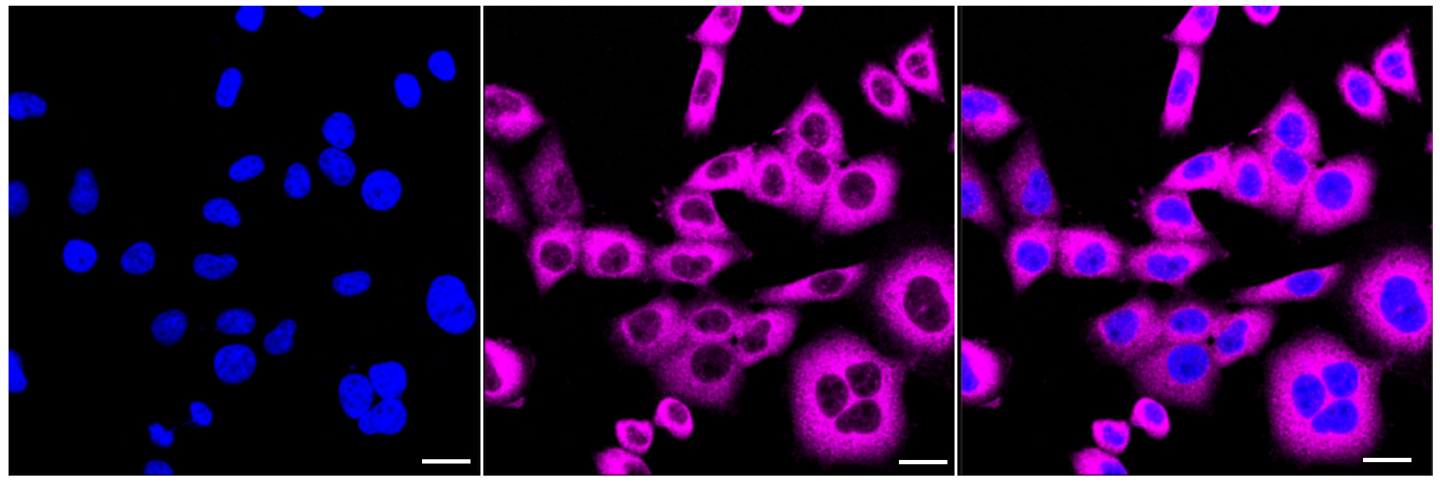 Immunocytochemical staining of HepG2 cells with USP9X antibody. Nuclei were stained blue with DAPI; USP9X was stained magenta with Alexa Fluor? 647. Images were taken using Leica stellaris 5. Protein abundance based on laser Intensity and smart gain: High. Scale bar: 20 μm.