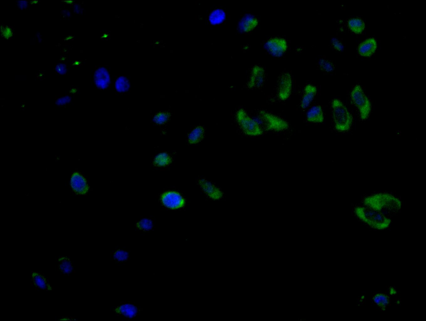 Immunofluorescence staining of Hela cell with CSB-RA282889A0HU at 1:50, counter-stained with DAPI. The cells were fixed in 4% formaldehyde and blocked in 10% normal Goat Serum. The cells were then incubated with the antibody overnight at 4°C. The secondary antibody was Alexa Fluor 488-congugated AffiniPure Goat Anti-Rabbit IgG(H+L).