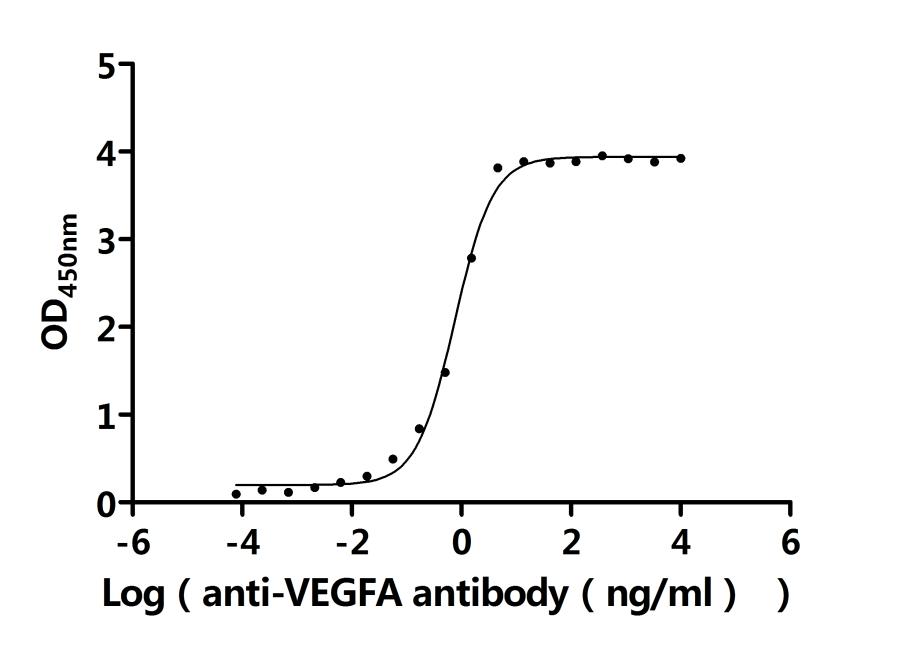 功能:Growth factor active in angiogenesis, vasculogenesis and endothelial cell growth. Induces endothelial cell proliferation, promotes cell migration, inhibits apoptosis and induces permeabilization of blood vessels. Binds to the FLT1/VEGFR1 and KDR/VEGFR2 receptors, heparan sulfate and heparin. NRP1/Neuropilin-1 binds isoforms VEGF-165 and VEGF-145. Isoform VEGF165B binds to KDR but does not activate downstream signaling pathways, does not activate angiogenesis and inhibits tumor growth. Binding to NRP1 receptor initiates a signaling pathway needed for motor neuron axon guidance and cell body migration, including for the caudal migration of facial motor neurons from rhombomere 4 to rhombomere 6 during embryonic development.