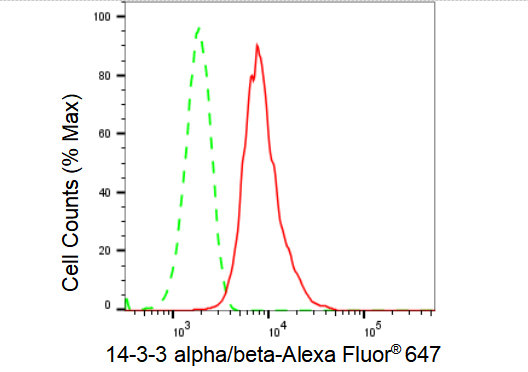 • Flow cytometric analysis of 14-3-3 alpha/beta expression in HepG2 cells using 14-3-3 alpha/beta antibody. Green, isotype control; red, 14-3-3 alpha/beta.