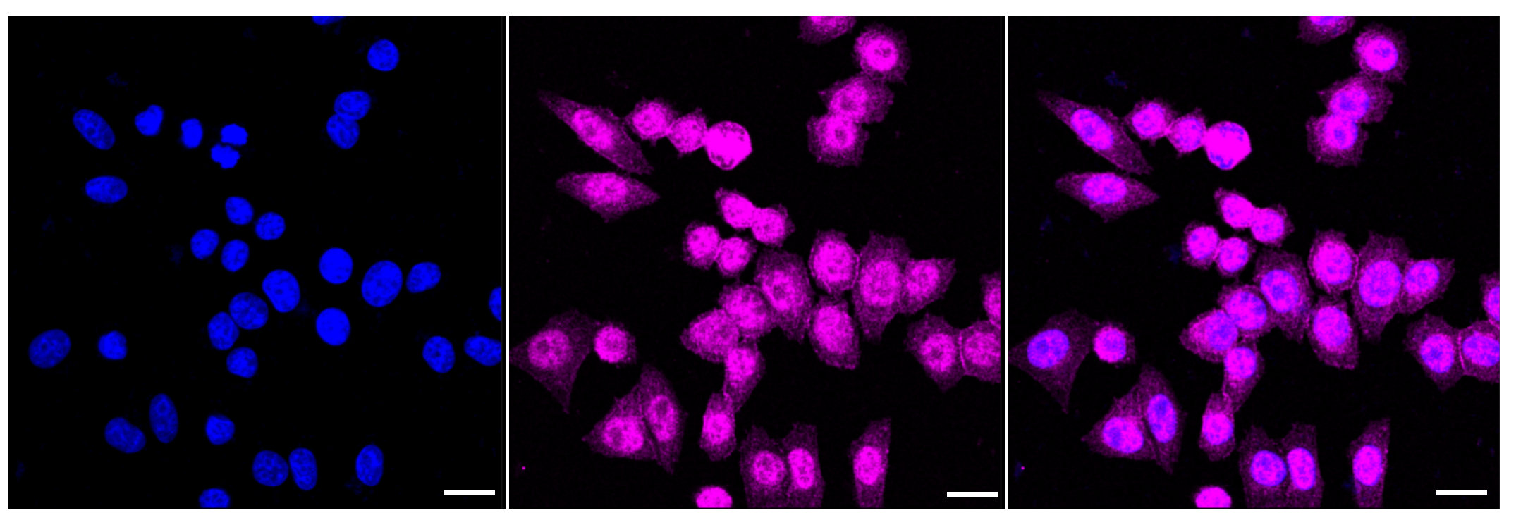 • Immunocytochemical staining of HepG2 cells with 14-3-3 alpha/beta antibody. Nuclei were stained blue with DAPI; 14-3-3 alpha/beta was stained magenta with Alexa Fluor? 647. Images were taken using Leica stellaris 5. Protein abundance based on laser Intensity and smart gain: High. Scale bar: 20 μm.