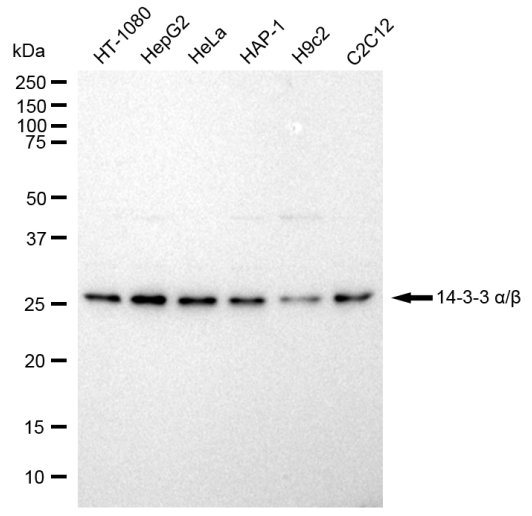 • Western blotting analysis using 14-3-3 alpha/beta antibody. Total cell lysates (30 μg) from various cell lines were loaded and separated by SDS-PAGE. The blot was incubated with 14-3-3 alpha/beta antibody and HRP-conjugated goat anti-rabbit secondary antibody respectively.