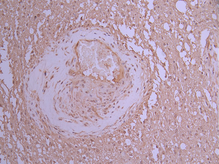 IHC image of CSB-RA115871A0HU diluted at 1:100 and staining in paraffin-embedded human glioma cancer performed on a Leica BondTM system. After dewaxing and hydration, antigen retrieval was mediated by high pressure in a citrate buffer (pH 6.0). Section was blocked with 10% normal goat serum 30min at RT. Then primary antibody (1% BSA) was incubated at 4°C overnight. The primary is detected by a Goat anti-rabbit polymer IgG labeled by HRP and visualized using 0.05% DAB.
