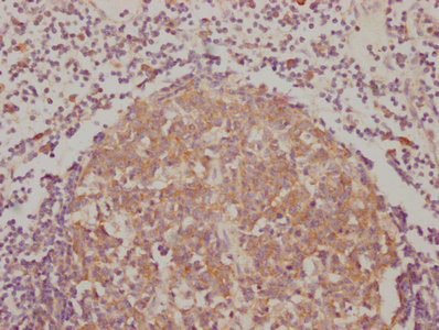 IHC image of CSB-RA624111A0HU diluted at 1:90 and staining in paraffin-embedded human lymph node tissue performed on a Leica BondTM system. After dewaxing and hydration, antigen retrieval was mediated by high pressure in a citrate buffer (pH 6.0). Section was blocked with 10% normal goat serum 30min at RT. Then primary antibody (1% BSA) was incubated at 4℃ overnight. The primary is detected by a biotinylated secondary antibody and visualized using an HRP conjugated SP system.