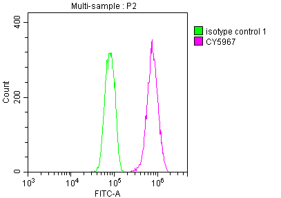 Overlay histogram showing Hela cells stained with CSB-RA964136A0HU (red line) at 1:50. The cells were fixed with 70% Ethylalcohol (18h) and then incubated in 10% normal goat serum to block non-specific protein-protein interactions followedby the antibody (1μg/1*106 cells) for 1 h at 4℃.The secondary antibody used was FITC-conjugated goat anti-rabbit IgG (H+L) at 1/200 dilution for 30min at 4℃. Control antibody (green line) was Rabbit IgG (1μg/1*106 cells) used under the same conditions. Acquisition of >10,000 events was performed.