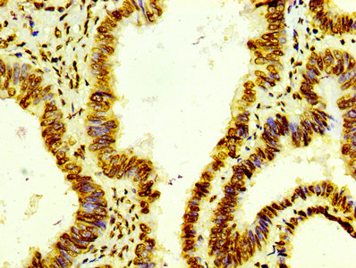 IHC image of CSB-RA010429A0HU diluted at 1:100 and staining in paraffin-embedded human colon cancer performed on a Leica BondTM system. After dewaxing and hydration, antigen retrieval was mediated by high pressure in a citrate buffer (pH 6.0). Section was blocked with 10% normal goat serum 30min at RT. Then primary antibody (1% BSA) was incubated at 4℃ overnight. The primary is detected by a biotinylated secondary antibody and visualized using an HRP conjugated SP system.