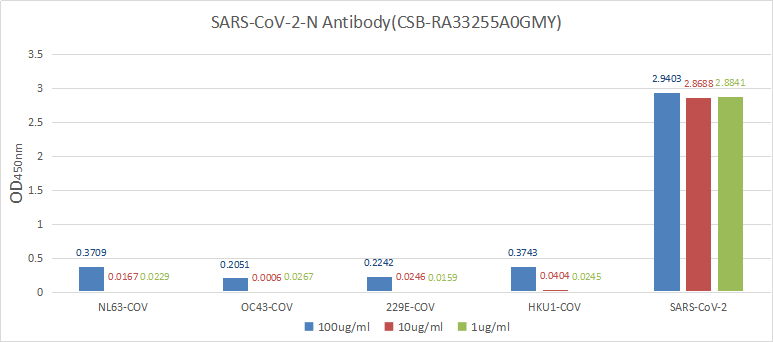 ELISA: Immobilize various types of SARS proteins at concentration of 2μg/ml on solid substrate, then react with SARS-CoV-2-N Antibody at concentration of 100μg/ml, 10μg/ml and 1μg/ml. It shows the SARS-CoV-2-N Antibody (CSB-RA33255A0GMY) is specific for SARS-CoV-2-N protein, without any cross-reactivity with NL63-CoV, HCoV-OC43, HCoV-229E or HCoV-HKU1.