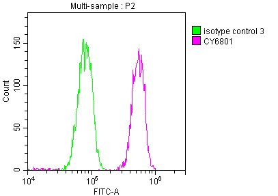 Overlay histogram showing Hela cells stained with CSB-RA569290A0HU (red line) at 1:50. The cells were fixed with 70% Ethylalcohol (18h) and then incubated in 10% normal goat serum to block non-specific protein-protein interactions followedby the antibody (1μg/1*106 cells) for 1 h at 4℃.The secondary antibody used was FITC-conjugated goat anti-rabbit IgG (H+L) at 1/200 dilution for 30min at 4℃. Control antibody (green line) was Rabbit IgG (1μg/1*106 cells) used under the same conditions. Acquisition of >10,000 events was performed.
