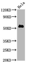 Immunofluorescence staining of Hela cells with CSB-RA015270A62phHU at 1:100,counter-stained with DAPI. The cells were fixed in 4% formaldehyde, permeabilized using 0.2% Triton X-100 and blocked in 10% normal Goat Serum. The cells were then incubated with the antibody overnight at 4℃. The secondary antibody was Alexa Fluor 488-congugated AffiniPure Goat Anti-Rabbit IgG (H+L).