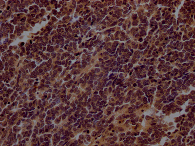 IHC image of CSB-RA798840A0HU diluted at 1:100 and staining in paraffin-embedded human lung cancer performed on a Leica BondTM system. After dewaxing and hydration, antigen retrieval was mediated by high pressure in a citrate buffer (pH 6.0). Section was blocked with 10% normal goat serum 30min at RT. Then primary antibody (1% BSA) was incubated at 4℃ overnight. The primary is detected by a Goat anti-rabbit IgG polymer labeled by HRP and visualized using 0.05% DAB.
