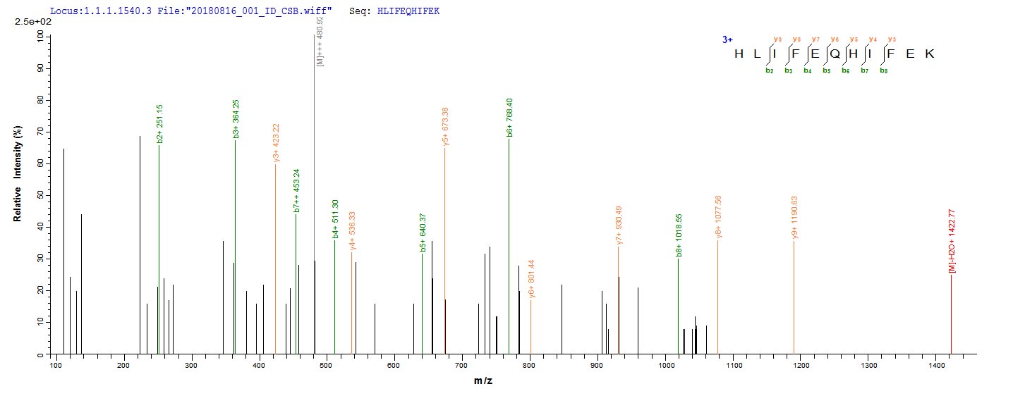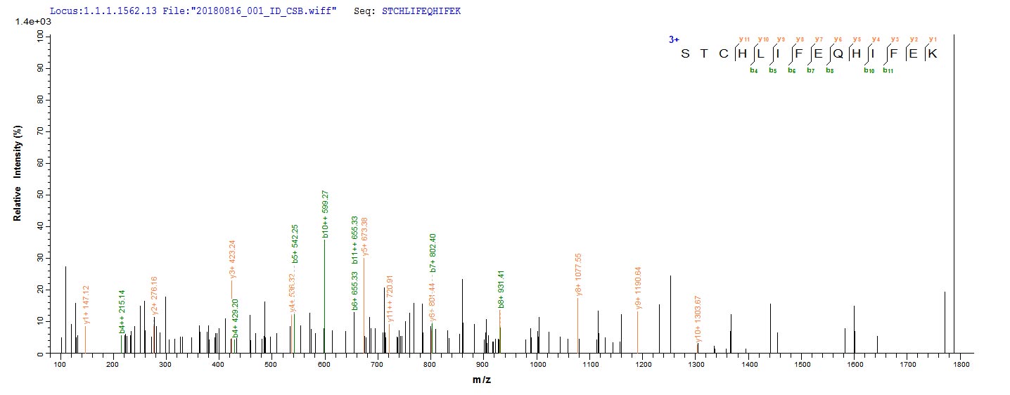 Based on the SEQUEST from database of E.coli host and target protein, the LC-MS/MS Analysis result of CSB-EP008570BO could indicate that this peptide derived from E.coli-expressed Bos taurus (Bovine) FDX1.