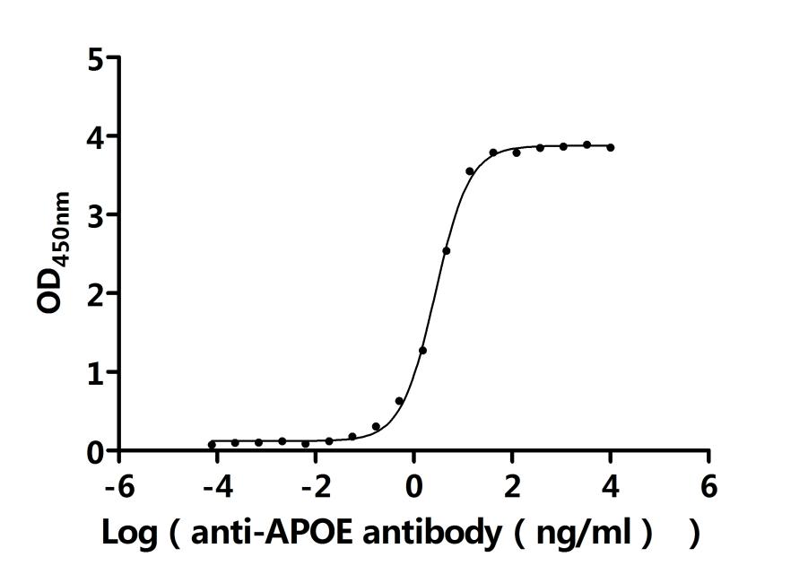 Measured by its binding ability in a functional ELISA. Immobilized Human APOE at 2 μg/ml can bind Anti-APOE recombinant antibody (CSB-RA001936MA1HU). The EC50 is 2.574-2.908 ng/mL. Biological Activity Assay