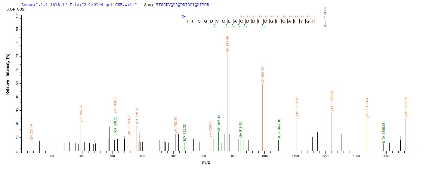 Based on the SEQUEST from database of E.coli host and target protein, the LC-MS/MS Analysis result of CSB-RP070094h could indicate that this peptide derived from E.coli-expressed Homo sapiens (Human) MMP1.