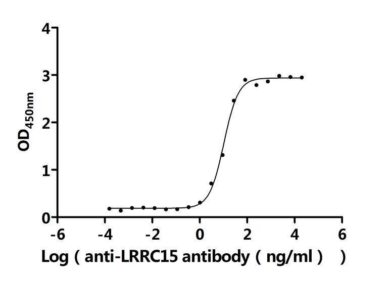 Measured by its binding ability in a functional ELISA. Immobilized Human LRRC15 at 2 μg/ml on an Nickel Coated plate can bind Anti-LRRC15 recombinant antibody (CSB-RA819484MA1HU). The EC50 is 12.18-15.75 ng/mL. Biological Activity Assay