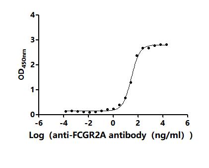 Measured by its binding ability in a functional ELISA. Immobilized Human FCGR2A at 2 μg/ml can bind Anti-FCGR2A recombinant antibody (CSB-RA008540MA1HU). The EC50 is 24.44-32.57 ng/mL. Biological Activity Assay -